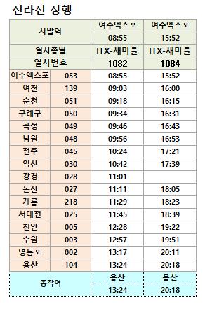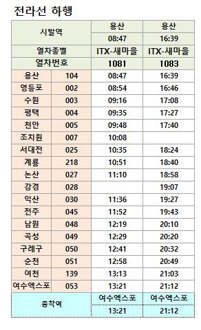 하루에 두번 운행하며 용산역에서-영등포역-수원역-평택역-천안역-조치원역-서대전역-계룡역-논산역-강경역-익산역-전주역-남원역-곡성역-구례구역-순천역-여천역-여수엑스포역까지 운행합니다.