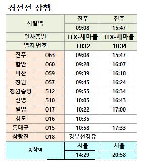 경전선은 주로 경부선을 경유하며 서울역을거쳐 삼량진역-동대구역-경산역-밀양역-진영역-창원중앙역-창원역-마산역-함안역-진주역까지 운행합니다.