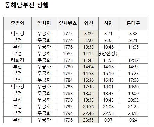 영천역을 지나가는 동해 남부선 상행 열차시간표입니다.
