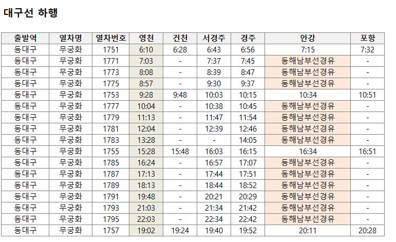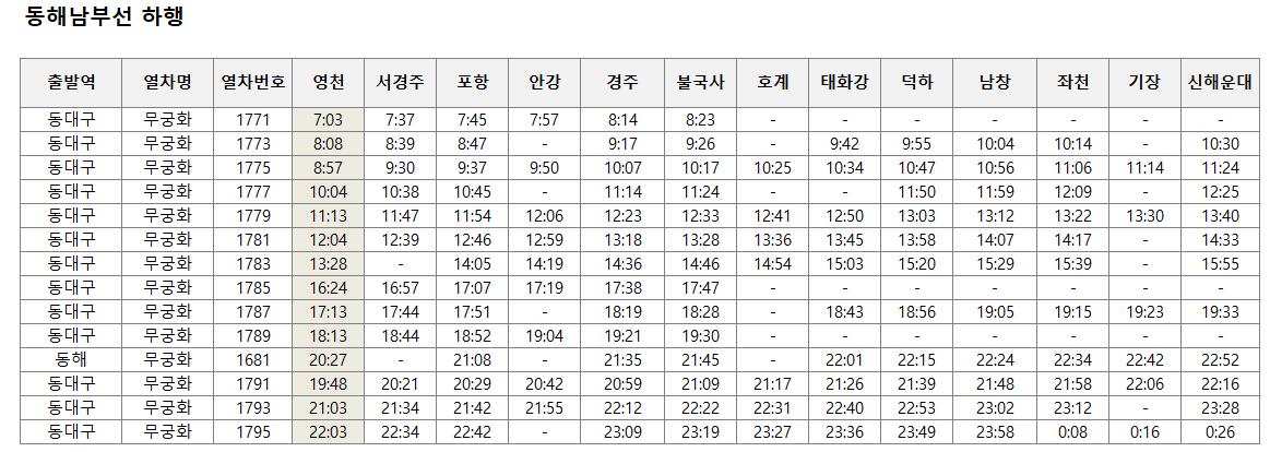 영천역 동해 남부선 하행열차 시간표입니다. 동대구 역이나 동해역을 출발해 영천역-서경주역-포항역-안강역-경주역-불국사역-호계역-태화강역-덕하역-남창역-좌천역-기장역-신해운대역까지 운행하는 열차 노선입니다.