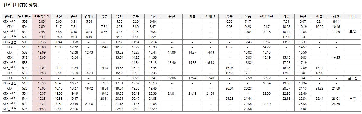 3. 여수엑스포역 KTX 열차 시간표(전라선)