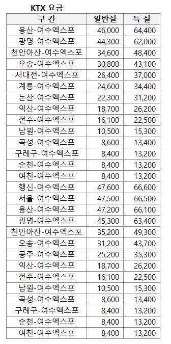 여수엑스포역을 출발하거나 도착하는 KTX와 새마을호,무궁화호 기차표 요금입니다.