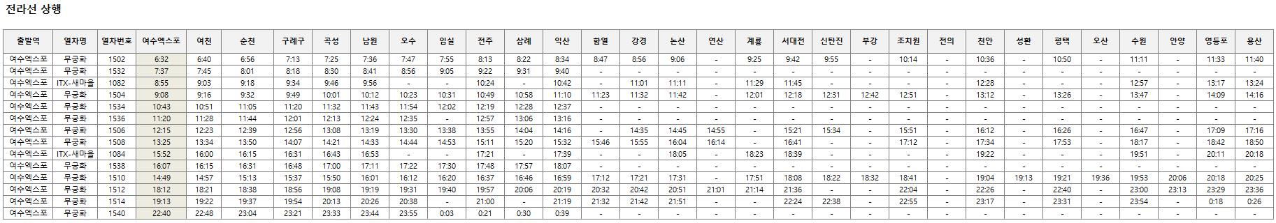 여수엑스포역을 종점으로 하는 무궁화호와 ITX 새마을호 종점 열차 시간표입니다.