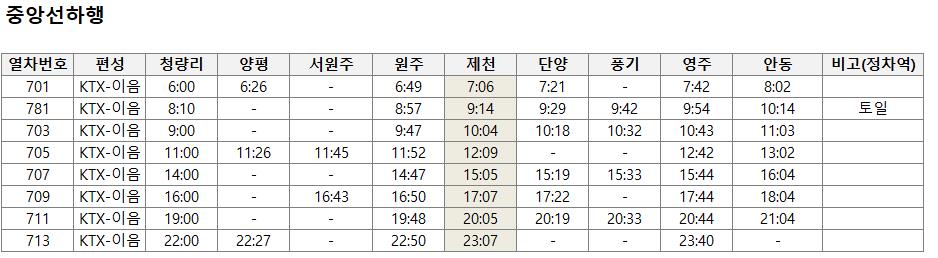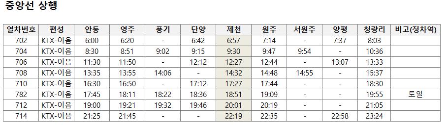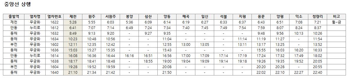 3. 제천역 태백선,중앙선 기차시간표(무궁화호)