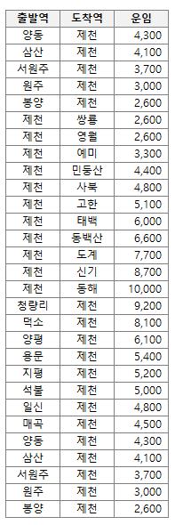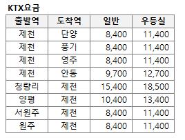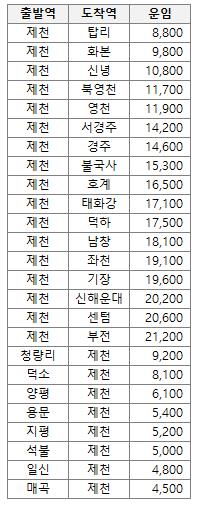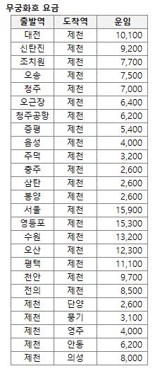 제천역을 출발하거나 도착하는 무궁화호 열차요금표 입니다.