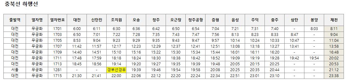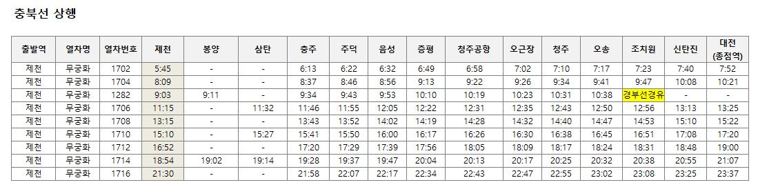제천역을 지나가는 충북선의 열차 시간표입니다.