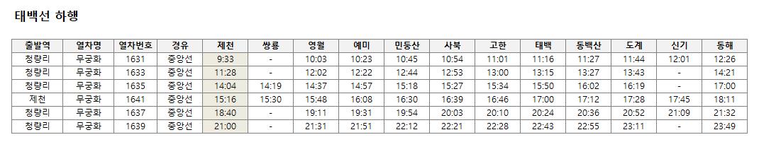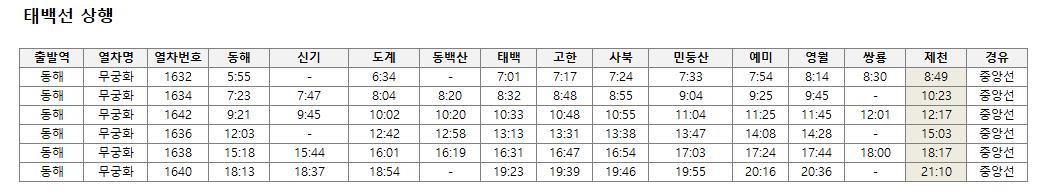 청량리역등에서 출발해 제천역과 쌍룡역 영월역-예미역-민둥산역-사북역-고한역-태백역-동백산역-도계역-신기역-동해역까지 운행합니다.