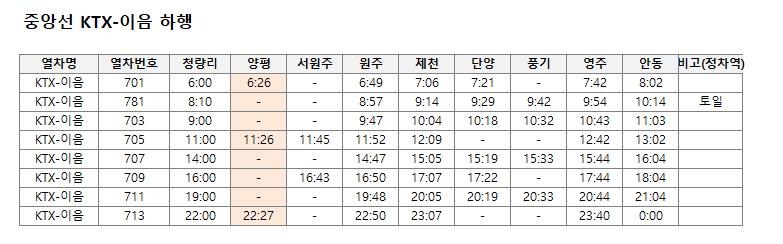 3. 양평역 중앙선 KTX-이음 기차 시간표