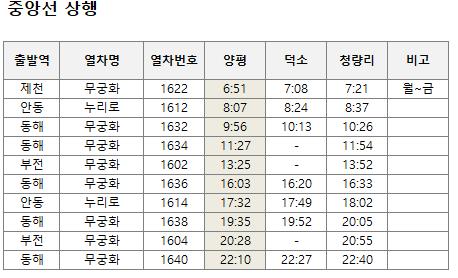 제천,안동,동해,부전역등을 출발해 양평역에서 덕소역-청량리역까지 가는 기차 시간표입니다.