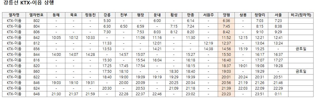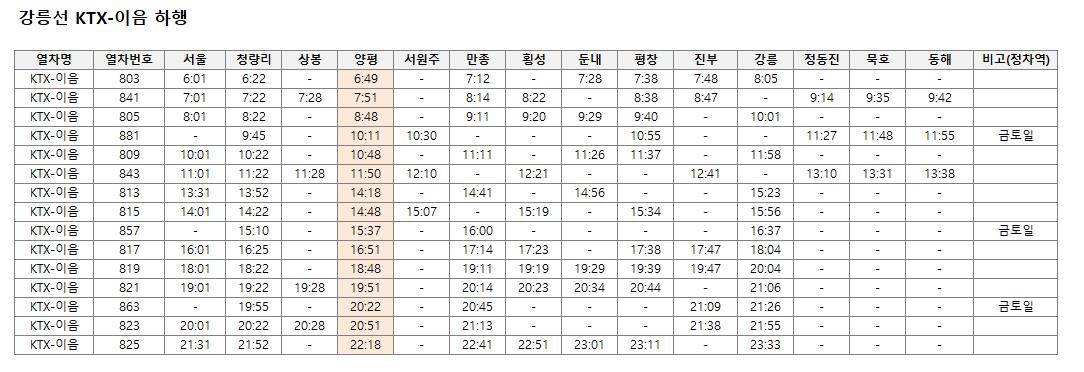 4. 양평역 강릉선 KTX-이음 기차 시간표