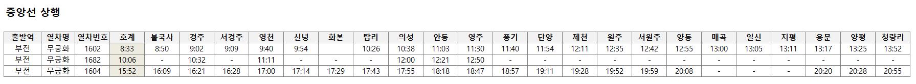 부전역을출발해 호계역-불국사역-경주역-영천역-신녕역-화본역-탑리역-의성역-안동역-영주역-풍기역-단양역-제천역-원주역-서원주역-양동역-매국역-일신역-지평역-용문역-양평역-청량리역까지 운행하는 중앙선 열차 상행선 시간표입니다.