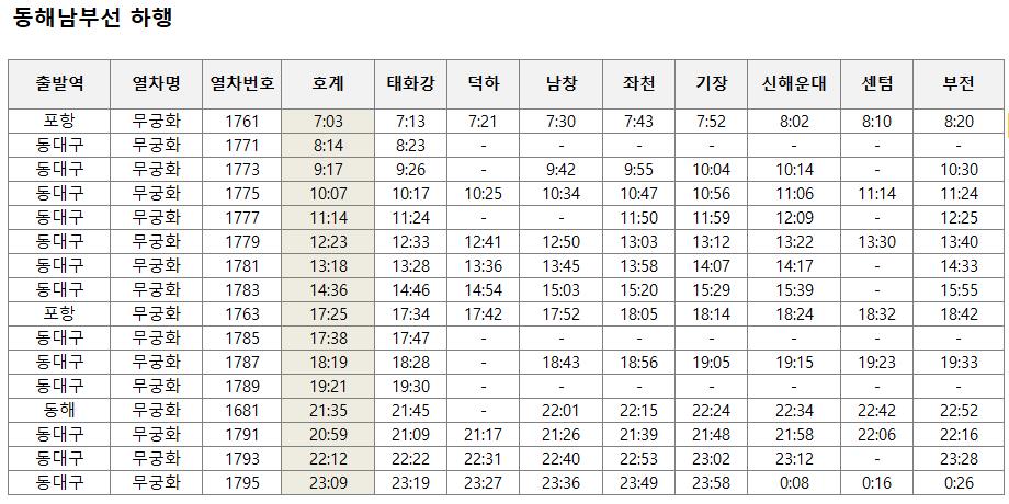 포항과 동대구,동해역등을 출발해 호계역-태화강역-덕하역-남창역-좌천역-기장역-신해운대역-센텀역-부전역까지 지나가는 노선입니다.
