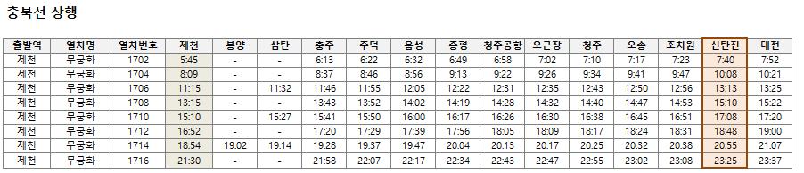 제천역에서 출발해 신탄진역-대전역까지 운행하는 충북선 상행 열차시간표입니다.