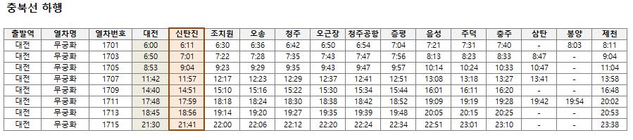 3. 신탄진역 충북선 기차시간표