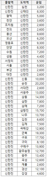 신탄진역을 출발하거나 도착하는 무궁화호 편도 요금입니다.